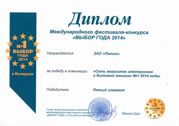 «5 элемент» объявлен победителем международного фестиваля-конкурса «Выбор Года» в номинации «Сеть магазинов электроники и бытовой техники №1 2014 года»!