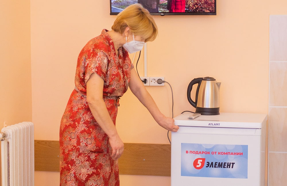 Оснащение больничных палат для ветеранов приобретено на средства, собранные в рамках проекта «Дай пять добру». Поддержать инициативу может каждый белорус. Для этого необходимо приобрести в сети магазинов электроники и бытовой техники «5 элемент» специальную сувенирную продукцию, все средства от продажи которой, совместно с Белорусским фондом мира расходуются на помощь детским учреждениям, больницам в период пандемии, а также поддержку культурных, социальных и спортивных проектов в Беларуси.