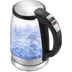 Преимущества: Стеклянная колба, выбор температуры нагрева, датчик температуры, подсветка воды во время кипячения, короткий шнур. Очень удобный и надежный механизм откидывания крышки.