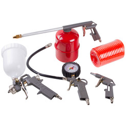 Комплект: Краскораспылитель с верхним бачком 0.6 л, Пистолет для накачки шин, Пистолет для продувки, Пистолет моечный, Спиральный шланг 4 м