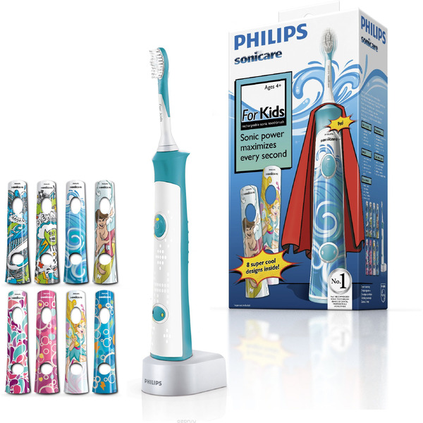 Комментарий: Я долгое время думала, какую зубную щетку приобрести своему малышу. Все старые щетки его быстро изнашиваются. Он теряет к ним всякий интерес и доходит уже до того, что отказывается чистить зубы. Размышляя, я подумала: - Почему бы ребенку не купить электрическую щетку. На сколько я слышала от своих подруг, что они детям нравятся и все ими только и пользуются. Просмотрев множество вариантов детских щеток я наткнулась на электрическую детскую щетку Philips Sonicare For Kids HX6311/07. Прочитав характеристику данного продукта на сайте Philips.ru/ я безоговорочно решилась на покупку электрической детской щетки. Пользуется ребенок ею уже почти месяц и теперь я могу с точностью написать отзыв этого продукта. Первое, что порадовало моего ребенка это наличие звукового сигнала. Он счел это забавным. А я подчеркнула для себя то, что не стоит наблюдать и контролировать его, когда он чистит зубы, так как щетка Philips Sonicare For Kids HX6311/07 автоматически выключается. Второе, нам понравилось наличие двух режимов. Ребенок может 1 минуту до звукового сигнала пользоваться одним, а после перейти на другой. Третье, в комплекте имеется так же по мимо самой зубной щетки наклейки для рукоятки щетки. Каждое утро мы клеем новую наклейку из дополнительного набора листа наклеек.