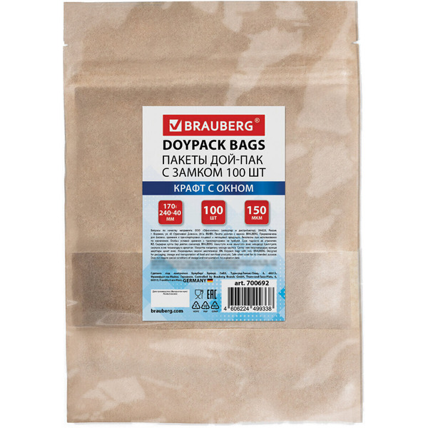 Пакет Дой-Пак с замком BRAUBERG 700692 (крафт с окном 60 мм, 170х240+40 мм, 100 шт, 150мкм)