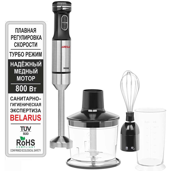 Преимущества: Плавная регулировка скорости, функция «ТУРБО, ножка блендера из нержавеющей стали, съемная насадка-блендер с 4-х лопастным ножом, измельчитель в комплекте