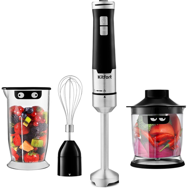 Преимущества: Стильный дизайн. Супер мощный. 3 в 1. Насадка-блендер, насадка-венчик, чаша измельчителя.