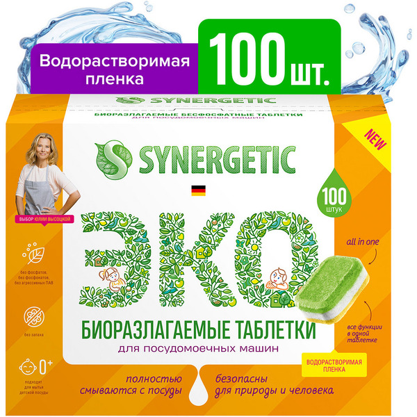 Биоразлагаемые бесфосфатные таблетки для посудомоечных машин Synergetic 100шт (102100)