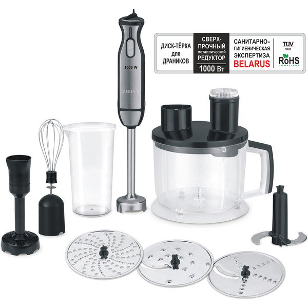 Преимущества: Мощность 1000 Вт, объем чаши 1.75 л, плавная регулировка оборотов, система защитной блокировки, 4-лопастной нож
