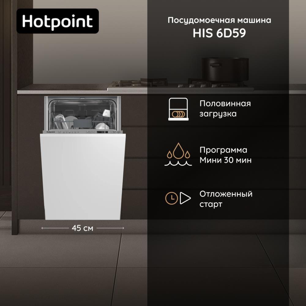 Встраиваемая посудомоечная машина Hotpoint HIS 6D59 имеет компактный размер и идеально вписывается в современные кухни. При этом модель вмещает до 9 комплектов посуды и подходит для семьи из 2-3 человек.
