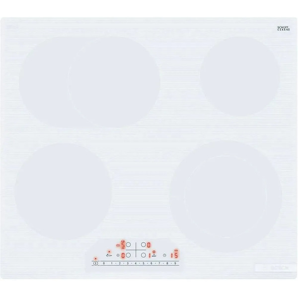 Белая варочная панель Bosch PKN652FP2E использует технологию Hi-Light и обеспечивает мгновенный нагрев. Общая мощность 8,3 кВт позволяет одновременно задействовать все зоны и не терять скорость приготовления даже при высокой загрузке.