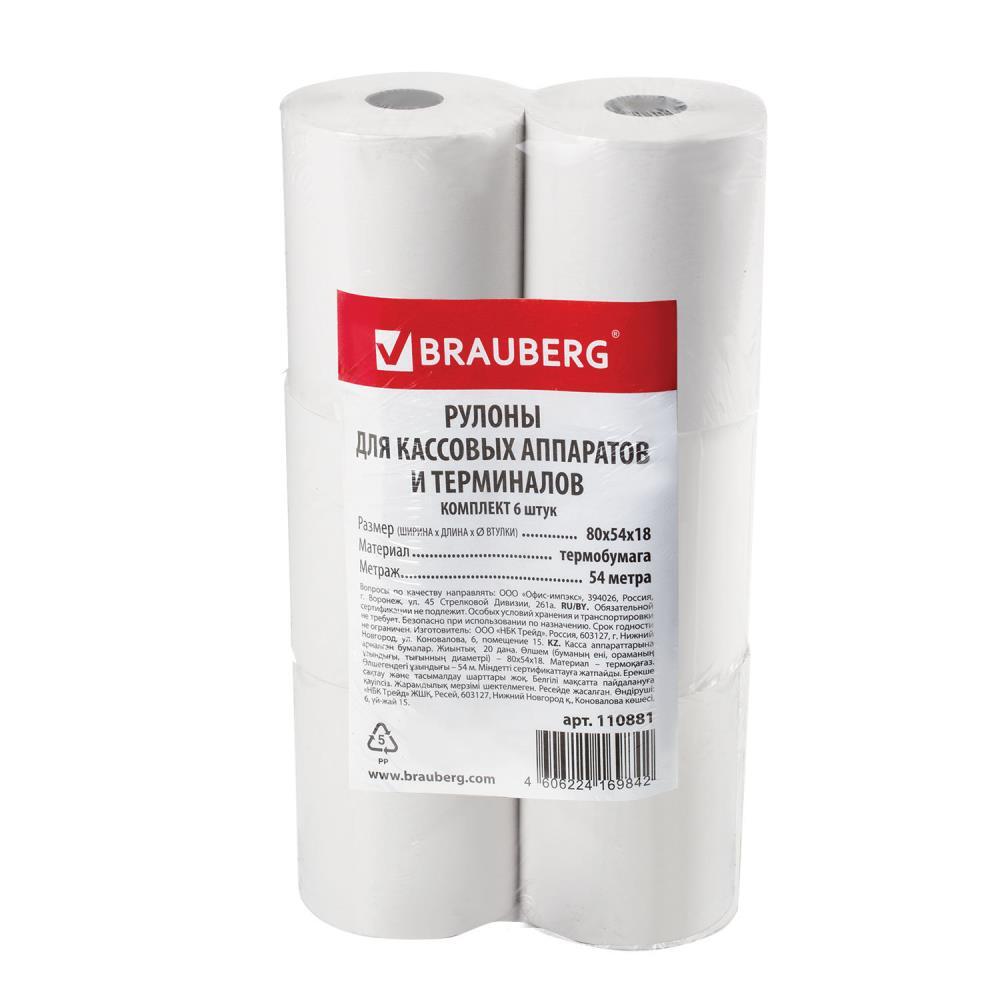 Чековая лента BRAUBERG 110881 80мм(диаметр 61мм, длина 54м, втулка 18мм), 6 шт.