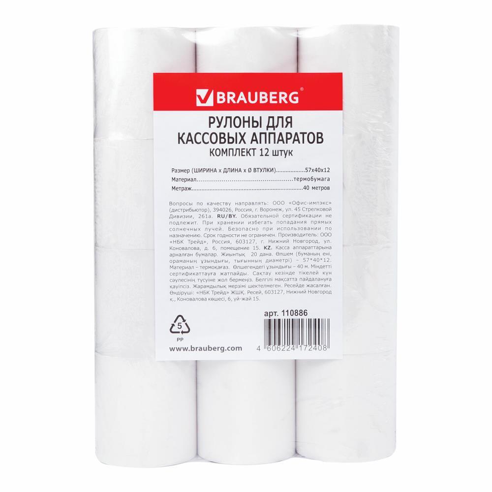 Чековая лента BRAUBERG 110886 57мм(диаметр 51мм, длина 40м, втулка 12мм), 12 шт.