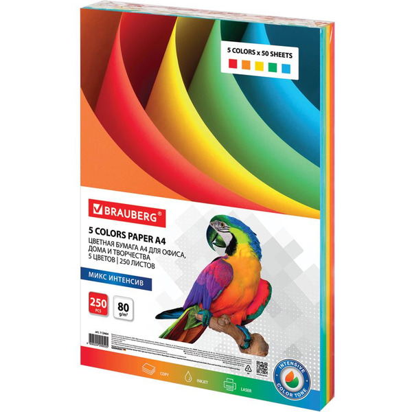 Бумага цветная BRAUBERG 112464 А4, 80г/м, 250 л, (5цв.х50л), интенсив